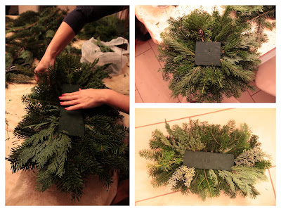 Zunächst müssen sehr sehr viele Tannenzweige unterschiedlichster Sorten, eingekauft werden (es ist hier von Vorteil mit einer Floristin befreundet zu sein). Außerdem braucht man Moos, Steckmasse, Kerzen, eine Unterlage für den ganzen Kranz (z.B. einen Teller), Draht, so Kerzenhalterdingens, Draht, viele schöne kitschige Weihnachtsdeko und eine Heißklebepistole.